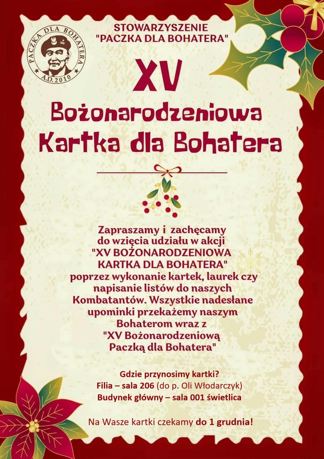 Zapraszamy całą społeczność szkolną do włączenia się w wyjątkową, świąteczną akcję „Bożonarodzeniowa Kartka dla Bohatera”. Jej celem jest przygotowanie kartek świątecznych, laurek lub listów dla naszych Kombatantów – ludzi, którym zawdzięczamy wolność i którzy zasługują na naszą pamięć oraz życzliwe słowo.